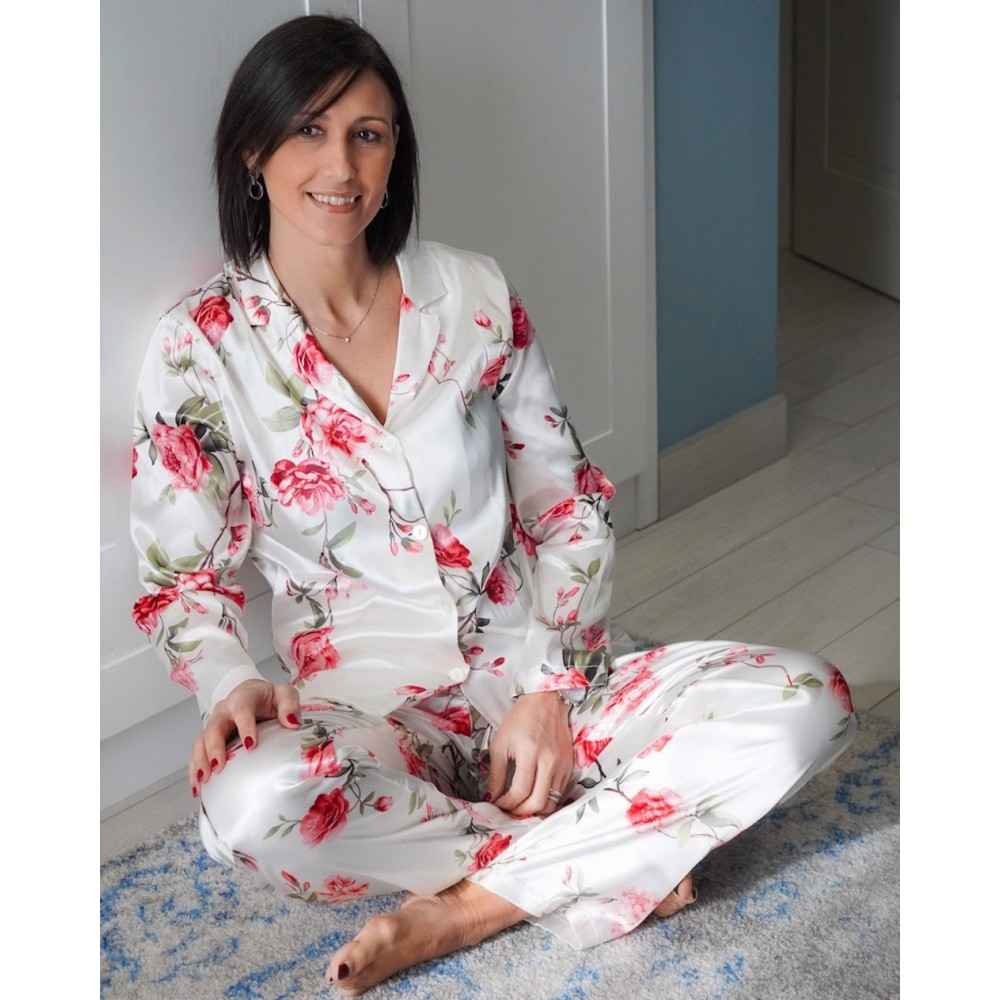 Pigiama Panna con motivi floreali, con tessuto effetto raso con maglia a manica lunga e bottoni e pantalone lungo. Elegante e raffinato, per essere belle anche in casa. Maglia con bottoni sulla parte anteriore, pantaloni con elastico in vita.