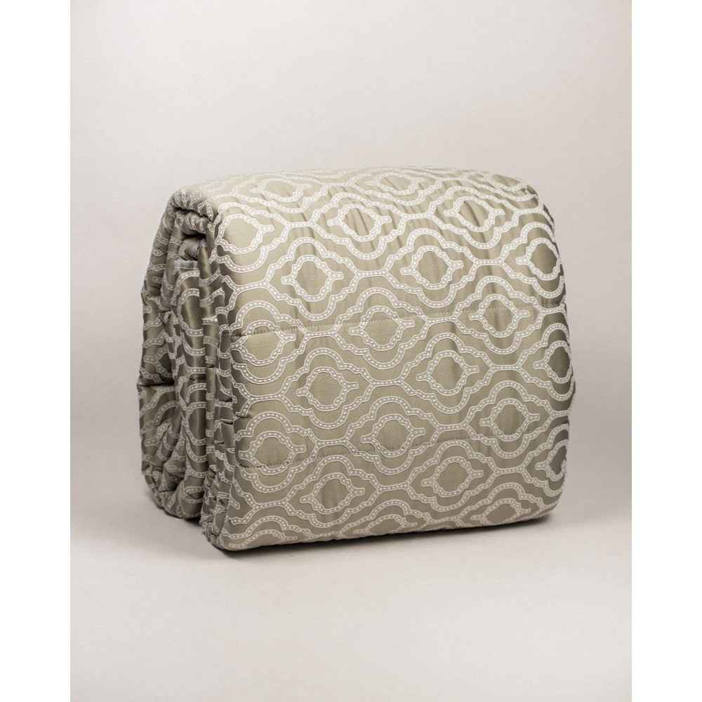 La trapunta Sophia è in fine raso jacquard, caratterizzata da un motivo geometrico bianco a rilievo.