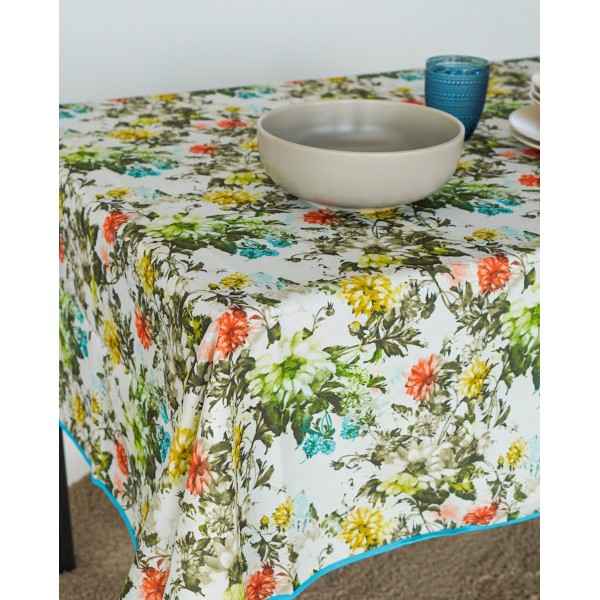 Tovaglia Antimacchia Floreale 6 posti dai Colori nei Toni dell'Arancio Giallo e Celeste