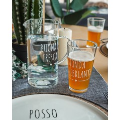 Bicchieri da Birra trasparenti, decorati con scritte divertenti. Design minimal e d'effetto. Sceglila tua frase preferita e abbinali ai Piatti Pizza e alla caraffa. Sono realizzati in vetro trasparente per garantire la massima resistenza all'utilizzo quotidiano.