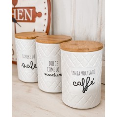 In ceramica con coperchio ermetico in legno. Venduti singolarmente, puoi scegliere il barattolo che preferisci.