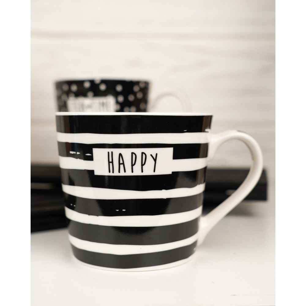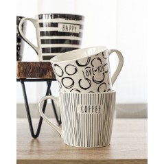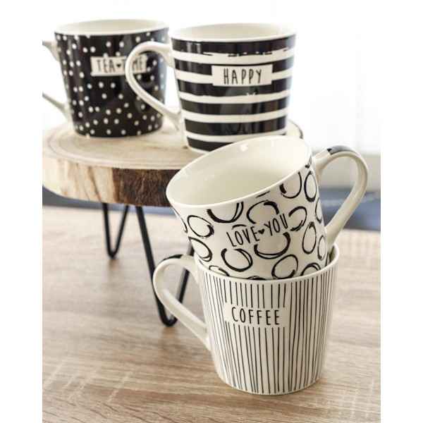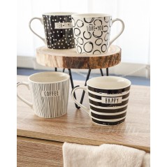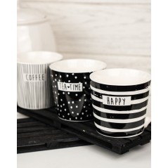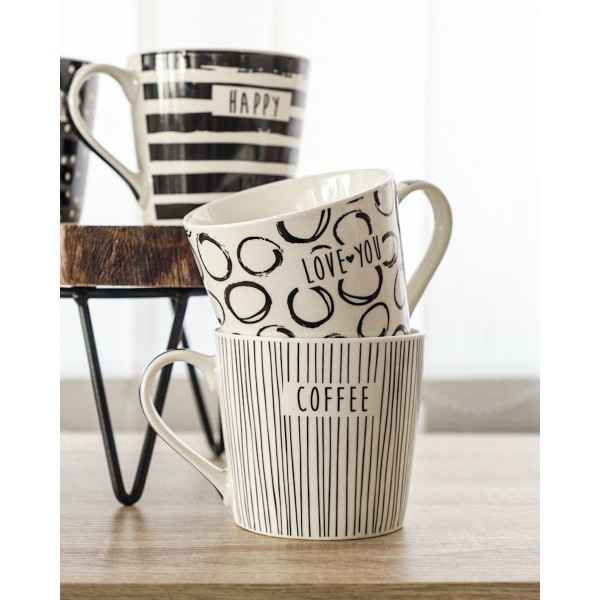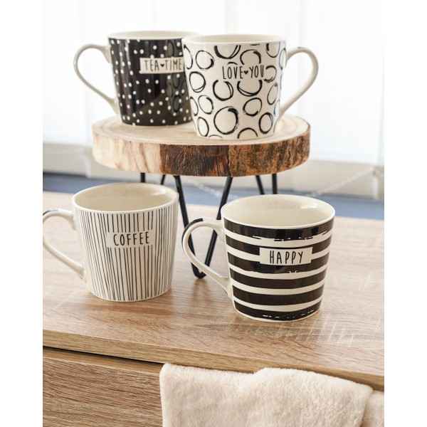 Tazza Party in quattro differenti varianti, tutte le tazze sono in bianco e nero ma con diverse fantasie: a righe con la scritta "Happy", a pois con la scritta "Tea time", a righe verticali con la scritta "Coffee" e con cerchi e la scritta "Love you". Perfette per sorseggiare da soli o in compagnia del thè o del caffè.