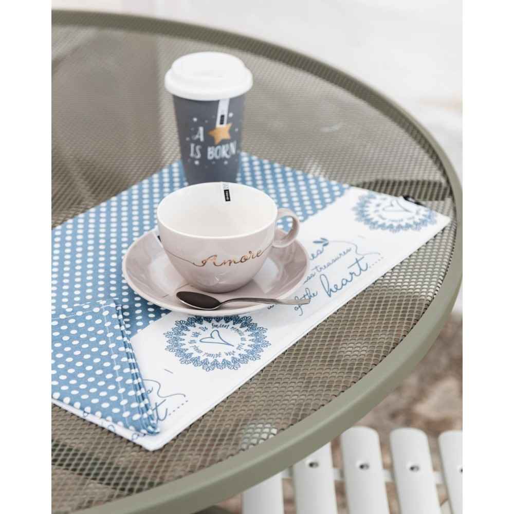 Tovaglietta colazione a pois con tovagliolo con balza disegnata.