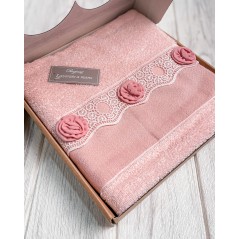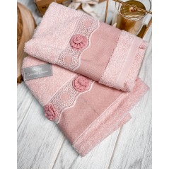 Delicatissimi e particolari questi asciugamani del marchio Preziosa! Si tratta di un set composto da due asciugamani, uno viso e l'altro ospite. Gli asciugamani presentano del pizzo e delle raffinate roselline, interamente lavorato a meno.