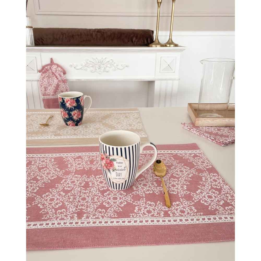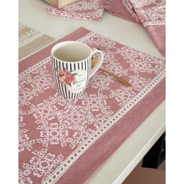 Tovaglietta colazione linea greca, in beige o in rosa, con applicazione merletto.