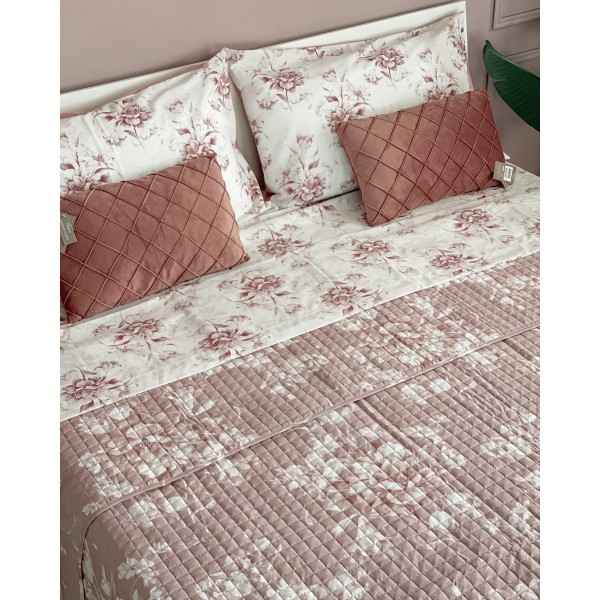 Delicati fiori percorrono tutto il trapuntino Quilt Elisa, delicati colori pastello: celeste, rosa e beige.