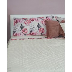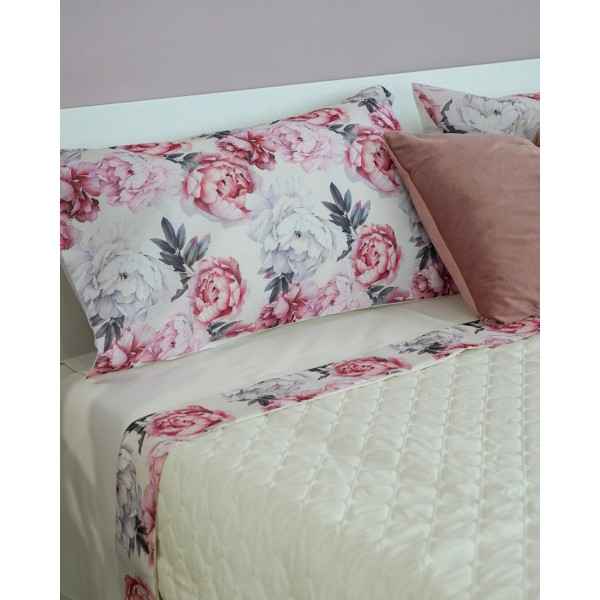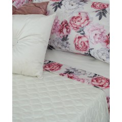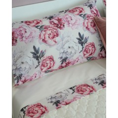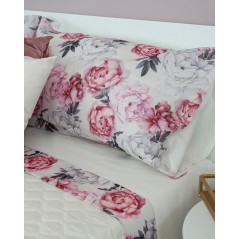 Questo completo lenzuola matrimoniale è di Nazareno Gabrielli, presenta un disegno floreale su tutta la parte anteriore delle federe e sul fascione del lenzuolo di sopra. Sul lato posteriore le federe sono in tinta unita dello stesso colore del lenzuolo di sotto con angoli e del lenzuolo di sopra.