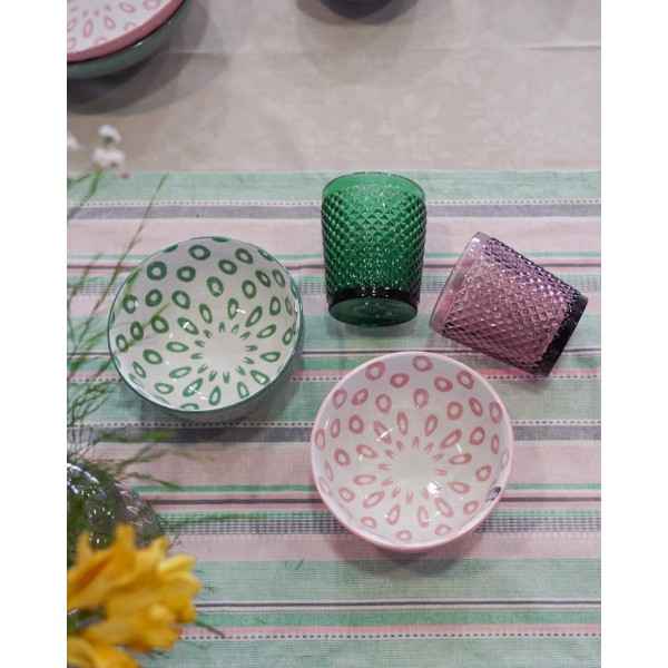 la bolo Dodi rosa da 640 cc fa parte di una linea simpatica e allegra di accessori da tavola, caratterizzata da un decoro a rilievo che ricorda le palline da golf e pensata per una mise en place sempre fresca e colorata. Questa bolo, ideale per una buona colazione o merenda con i tuoi cibi preferiti, è disponibile in due colori e lavabile in lavastoviglie ed idonea all'utilizzo in microonde.