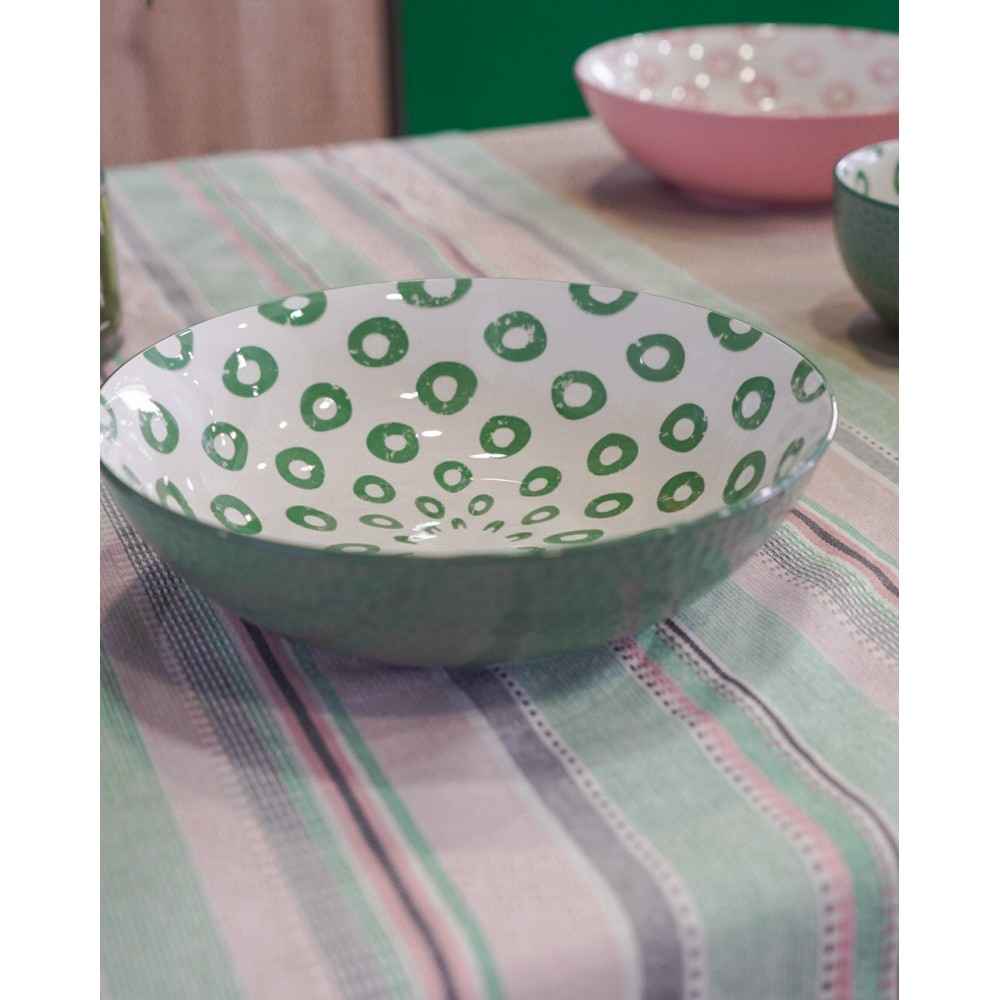 L'insalatiera Dodi verde da 22 cm fa parte di una linea simpatica e allegra di accessori da tavola, caratterizzata da un decoro a rilievo che ricorda le palline da golf e pensata in abbinato alla linea Jardin e al servizio piatti Novel per una mise en place sempre fresca e colorata. Questa insalatiera è disponibile in due colori ed è lavabile in lavastoviglie ed idonea all'utilizzo in microonde.