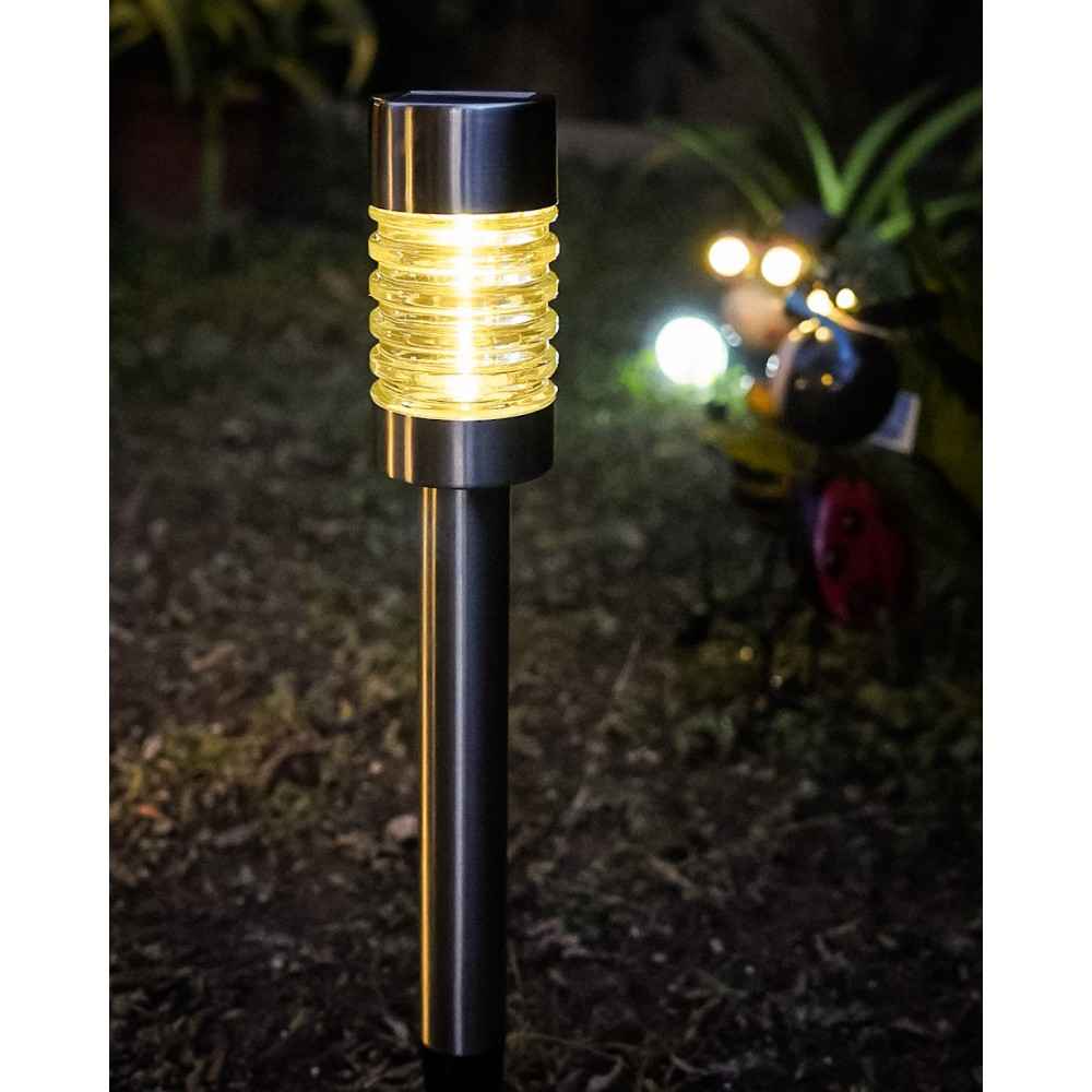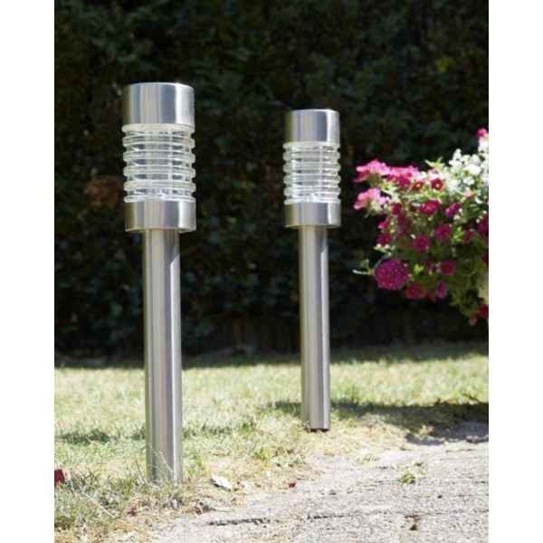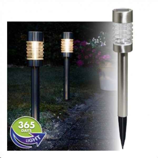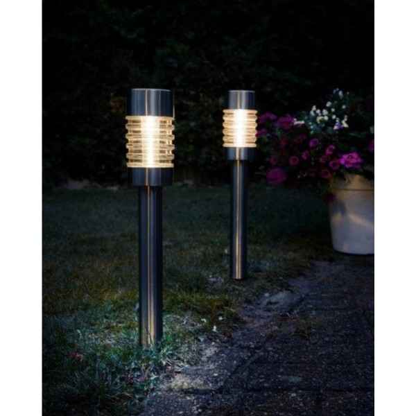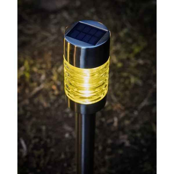 Lampada a energia solare. Questa lampada è adatta per l'illuminazione d'atmosfera di marciapiedi, prati e muretti di confine. Questa luce solare ecologica non richiede corrente domestica per funzionare, ma raccoglie l'energia direttamente dal sole. Pertanto particolarmente adatto per l'uso in aree in cui non arriva corrente elettrica e fornisce luce sufficiente per contrassegnare ingressi, passaggi pedonali e gradini. Ricorda che l'acciaio inossidabile non è un prodotto esente da manutenzione e che è necessario pulire le luci ogni 6 mesi per evitare lo scolorimento.