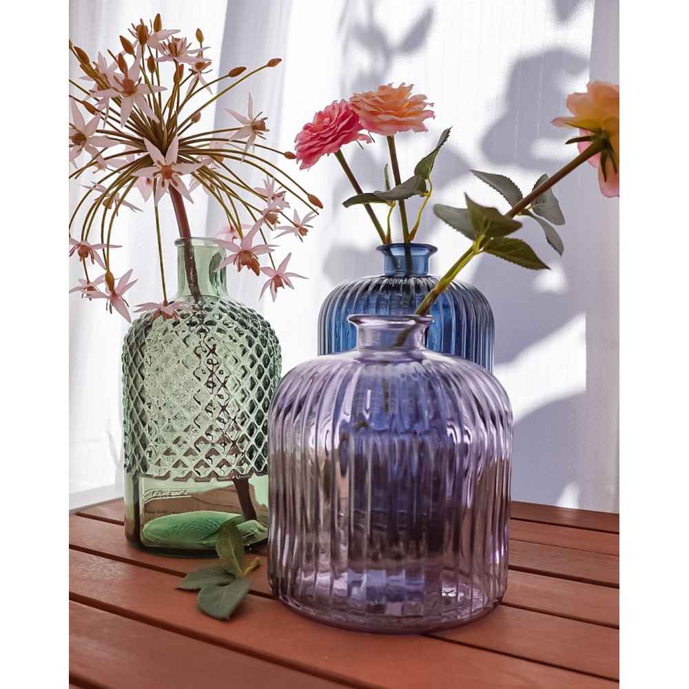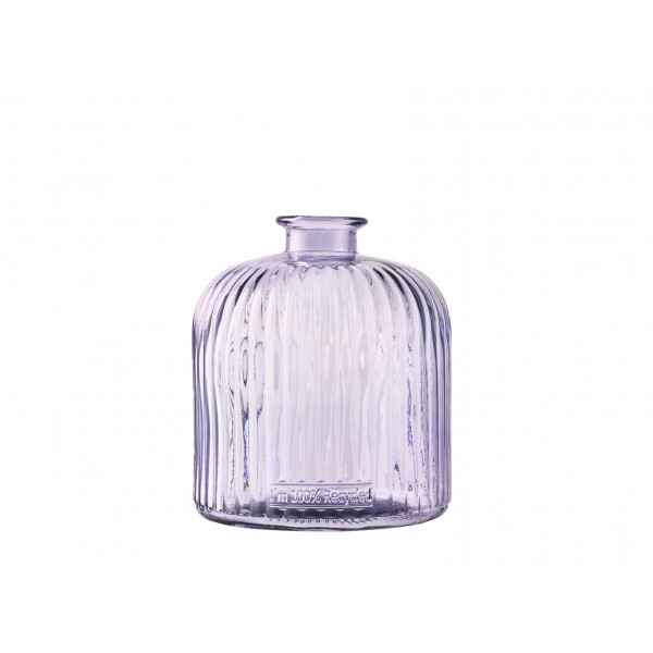 Vaso Daroca realizzato in vetro 100% riciclato di colore lilla, rigato in superficie, Altezza 18cm.