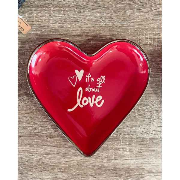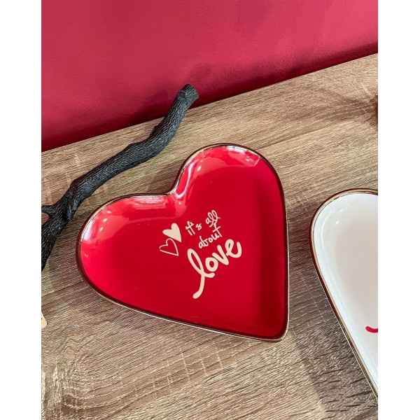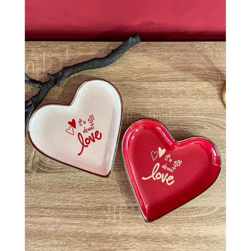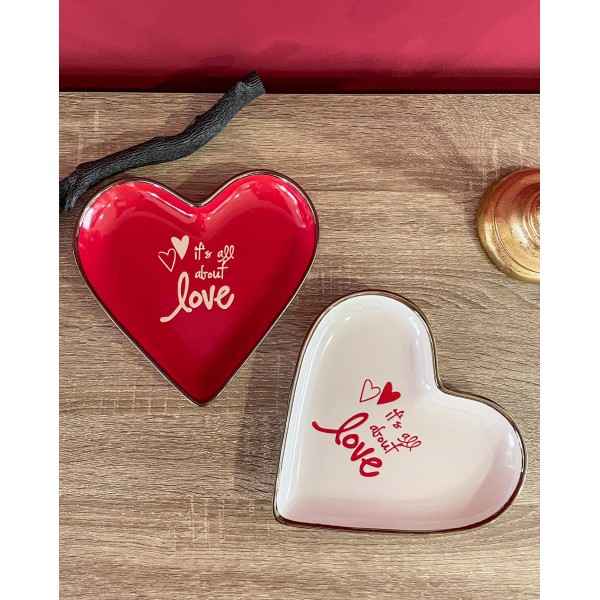 Il piatto cuore può essere utilizzato come svuotatasche, bello anche come idea regalo. Puoi scegliere tra due colori: rosso o bianco. Il piatto ha un bordo oro brunito e una scritta nel centro "It's all about Love".