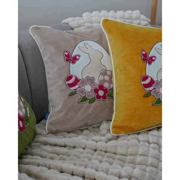 Cuscino in Ciniglia con inserti ricamati a punto spugna, in colori che riportano alle atmosfere pasquali, scaldando l’ambiente. Il cuscino è dotato di zip e ha un cordoncino per tutto il perimetro esterno. Imbottitura compresa.