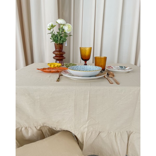 Tovaglia panama colore tinta unita, molto elegante, impreziosita da un grande frill lungo i borsi che la rende unica ed originale. In abbinamento puoi anche scegliere i cuscini coprisedia Frill della stessa linea.