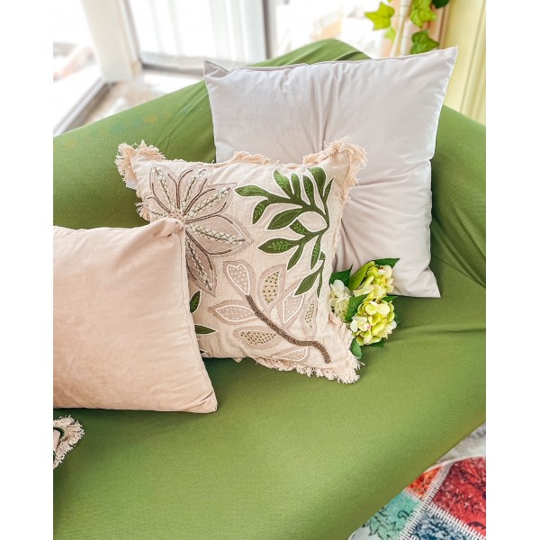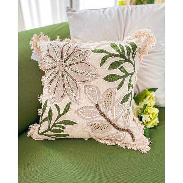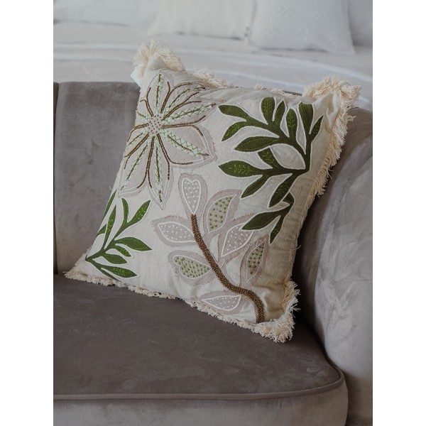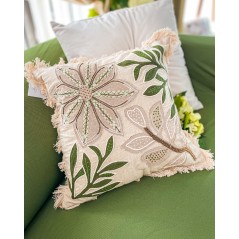 Cuscino arredo della linea Hanna Home, 45x45cm. Il cuscino è dotato di zip, è sfoderabile. Molto elegante, grazie alla parte anteriore con lavorazione con perline che creano un interessante disegno floreale che, il resto del disegno nei toni del beige e del verde. Finitura con Frange.