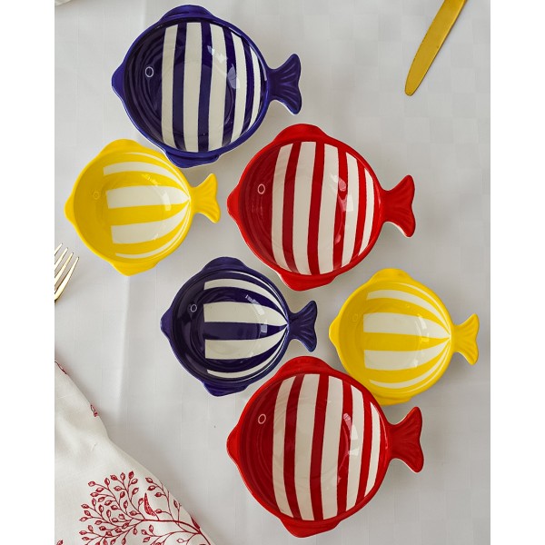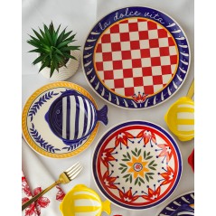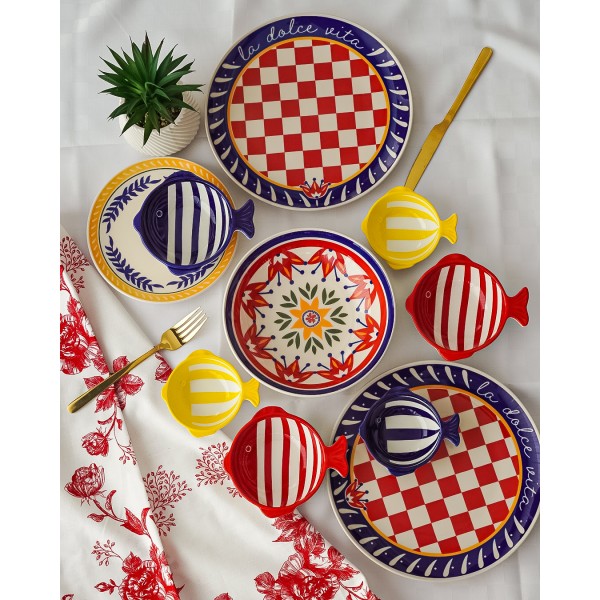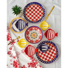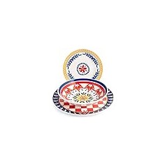 Piatti moderni, eleganti e resistenti. Ideali per la tavola di tutti i giorni oppure per le cene in compagnia. Creeranno un'atmosfera elegante grazie al loro design molto particolare. Pratici e resistenti. Questi piatti si distiguono per la loro originalità artigianale, per questo la diversità, uno dall'altro, li rende unici ed inimitabili. Blu, rosso e giallo i colori dominanti, piatto fondo, piano e frutta completamente diversi gli uni dagli altri.