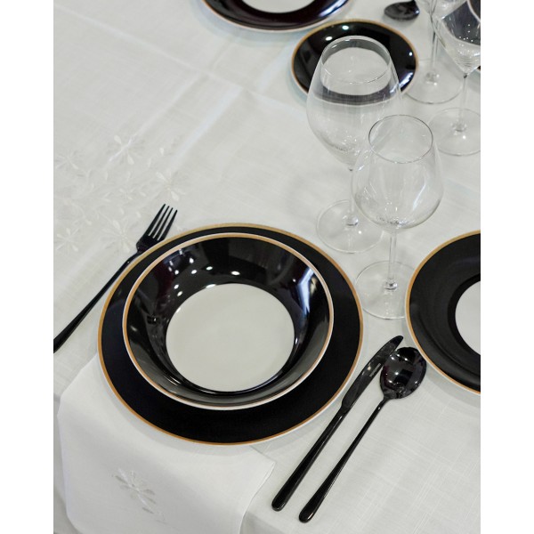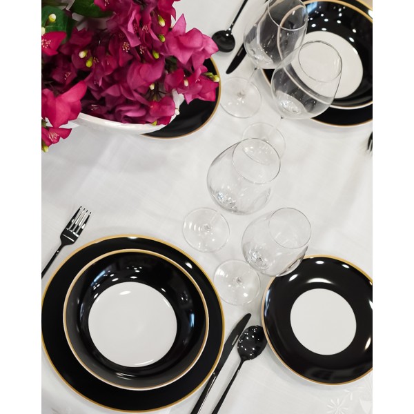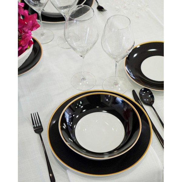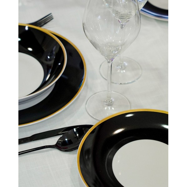 Servizio di piatti Onyx in porcellana fascia colore nero e bordino dorato. Con stile e con un pizzico di estrosità viene proposto l'accostamento dell'oro con il nero, un accoppiata raffinata e chic.
