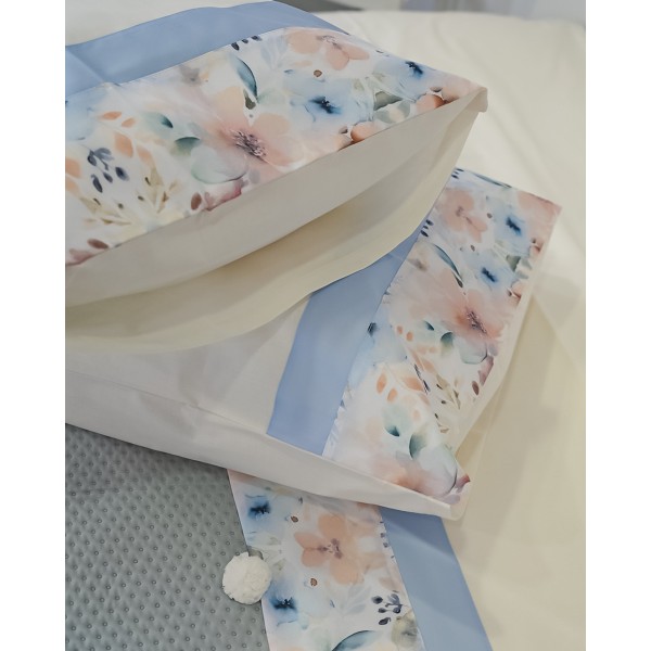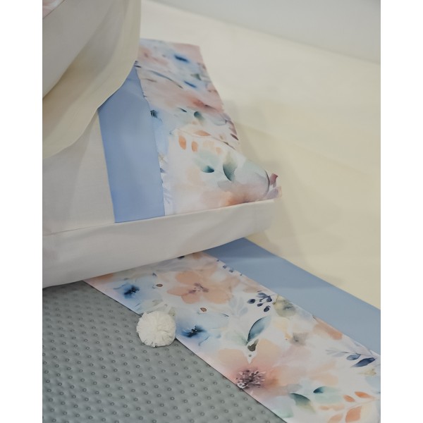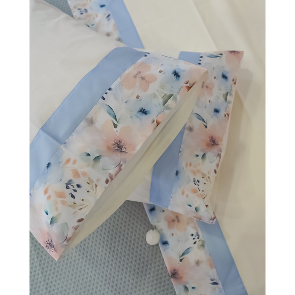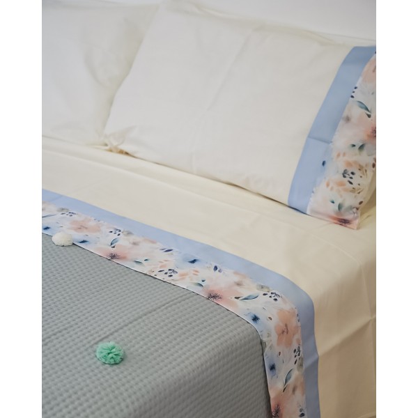 Il completo è in cotone e il set comprende: lenzuolo sopra, lenzuolo sotto e 2 federe a sacchetto.
