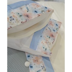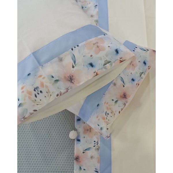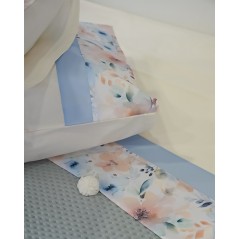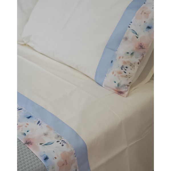 Questo completo lenzuola matrimoniale è di Nazareno Gabrielli, presenta un disegno con banda floreale, che richiama il lenzuolo di sopra. Le federe sono a sacchetto.
