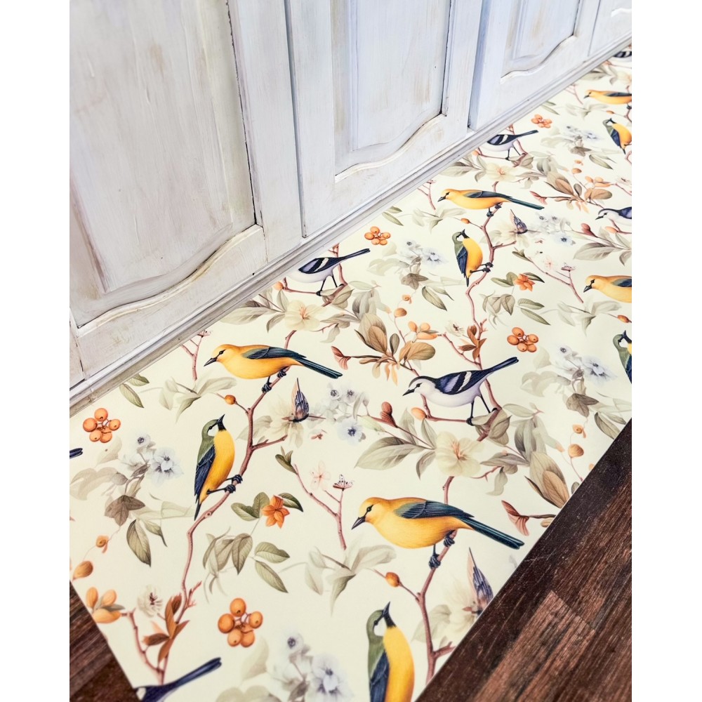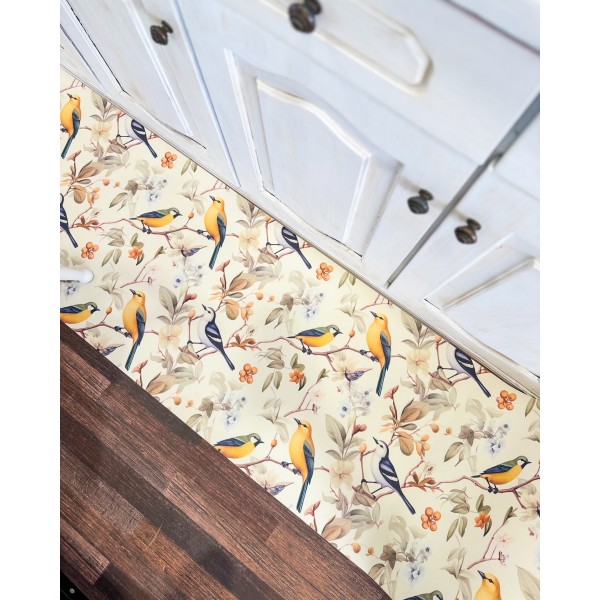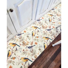 - Fondo crema/paglierino, uccellini dai toni del giallo, verde, bianco e blu nel piumaggio. Molto delicata.