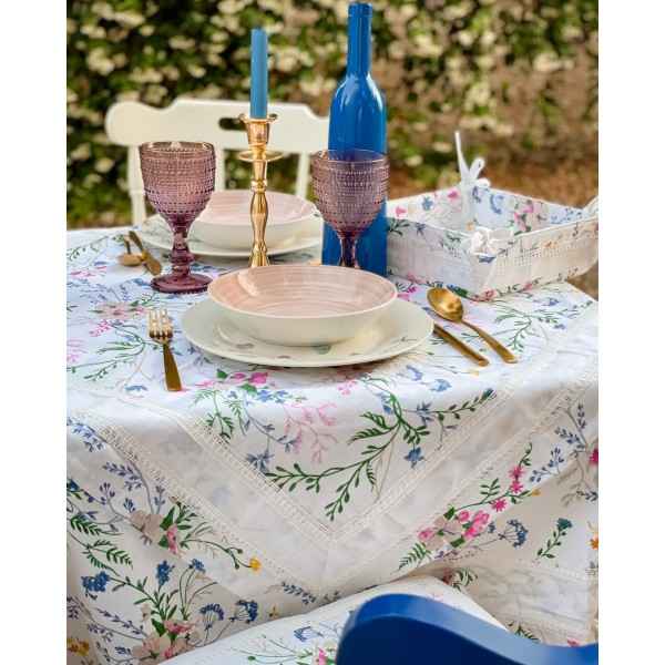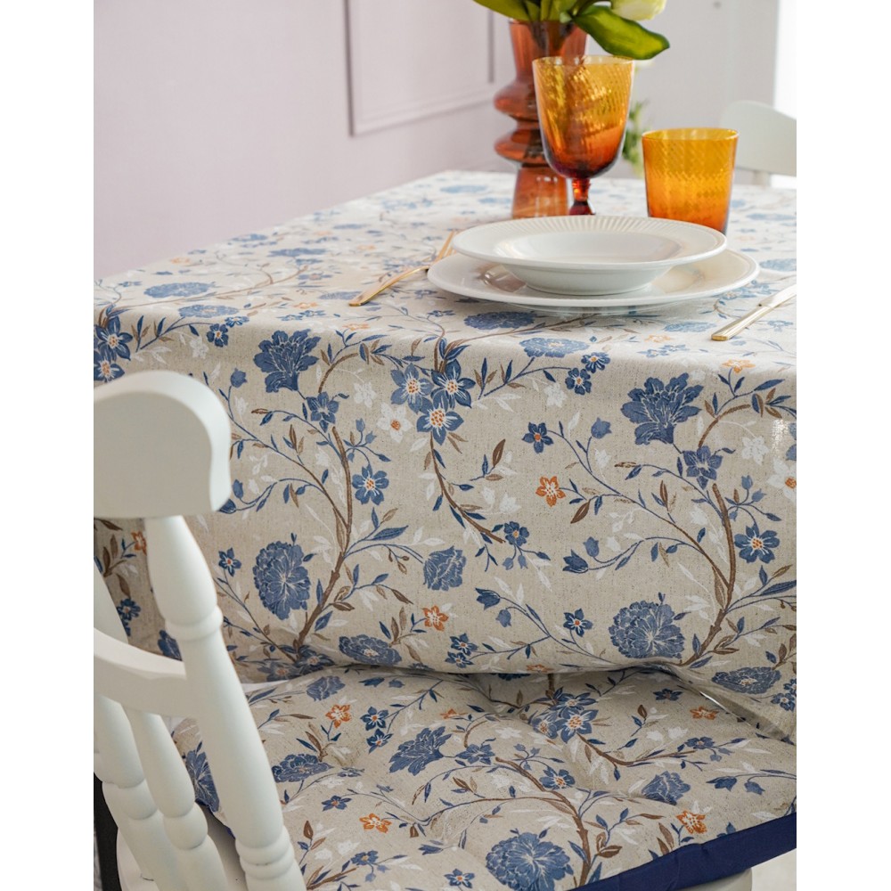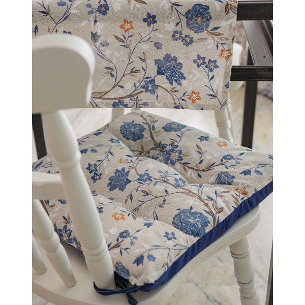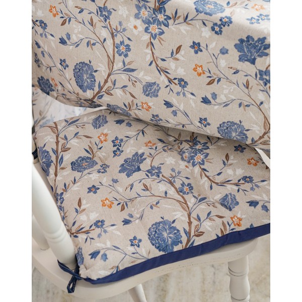 Dalla linea Flake, set da 6 pezzi cuscini coprisedia 4 punti con laccetto. Un floreale con base nei toni caldi del beige e con un floreale che varia dal blu al ruggine. Retro del cuscino tinta unita blu.