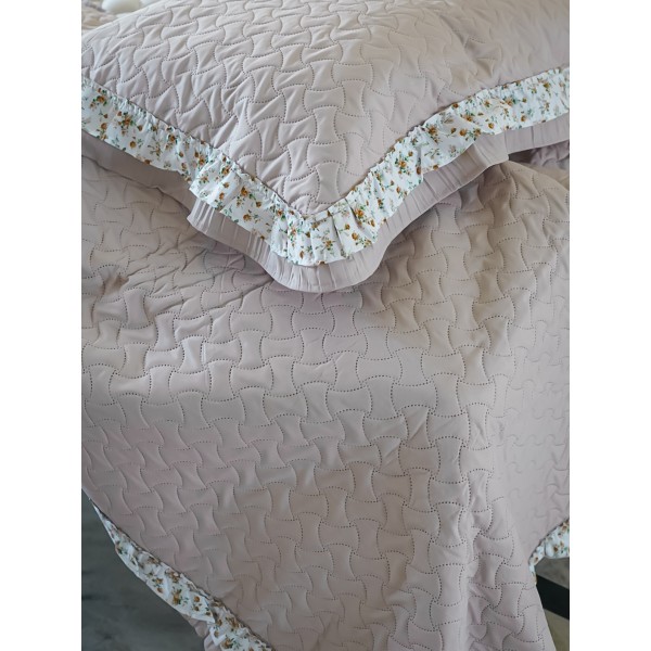 Trapuntino matrimoniale Primavera con due federe, di NAZARENO GABRIELLI, un trapuntino leggero, dal gusto sabbi. Presenta un tinta unit con una trapuntata puntata e una doppia balza di cui una con un floreale nei toni del rosa e del verde.