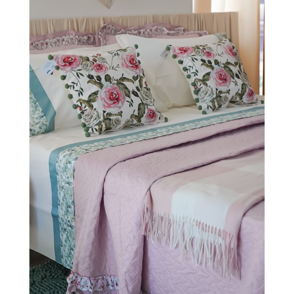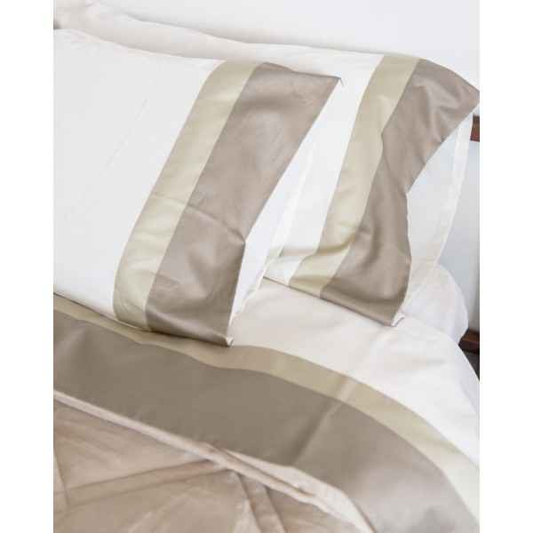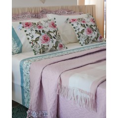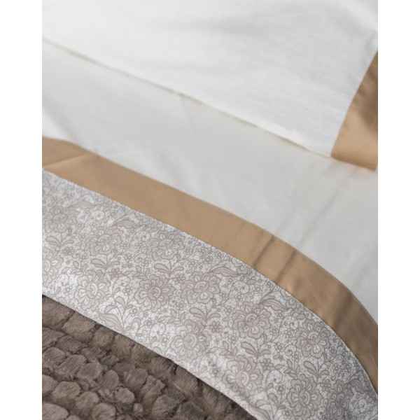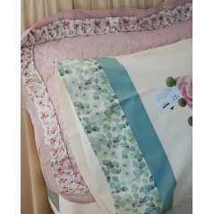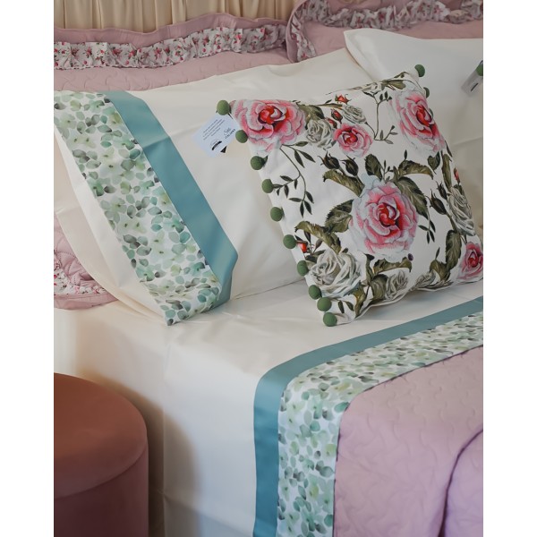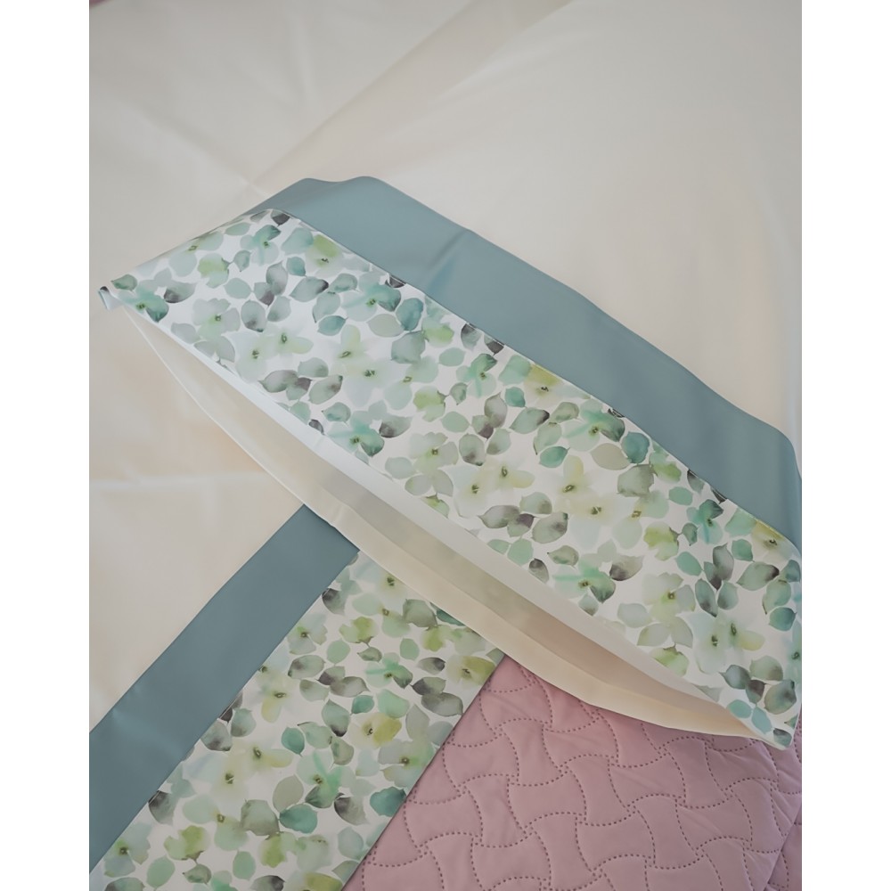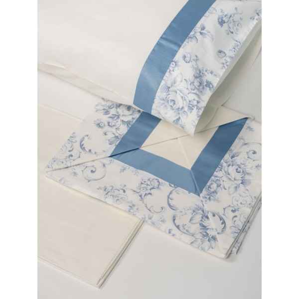 Questo completo lenzuola matrimoniale è di Nazareno Gabrielli, presenta un disegno con banda floreale, che richiama il lenzuolo di sopra. Le federe sono a sacchetto.