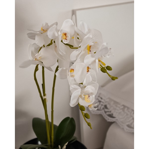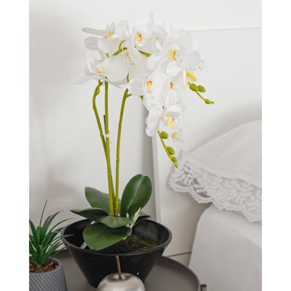 Vaso in plastica nero con terriccio artificiale e orchidea artificiale disponibile in due colori: un candido bianco o un più colorato magenta.