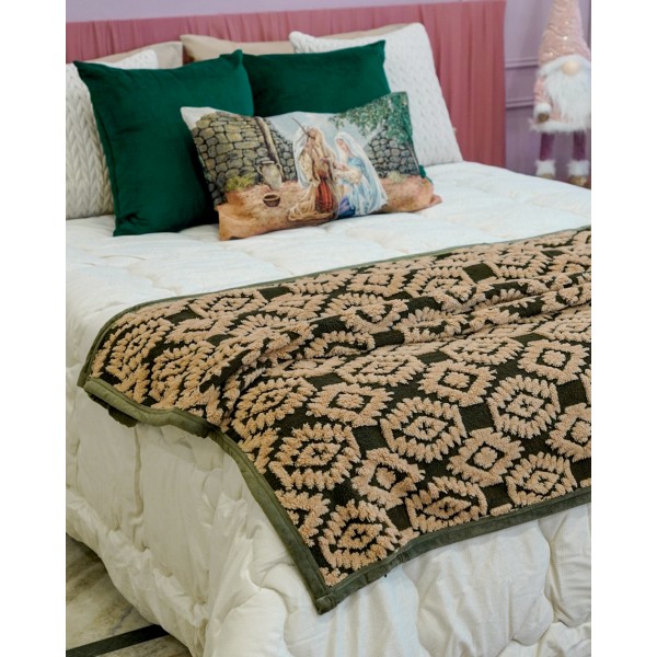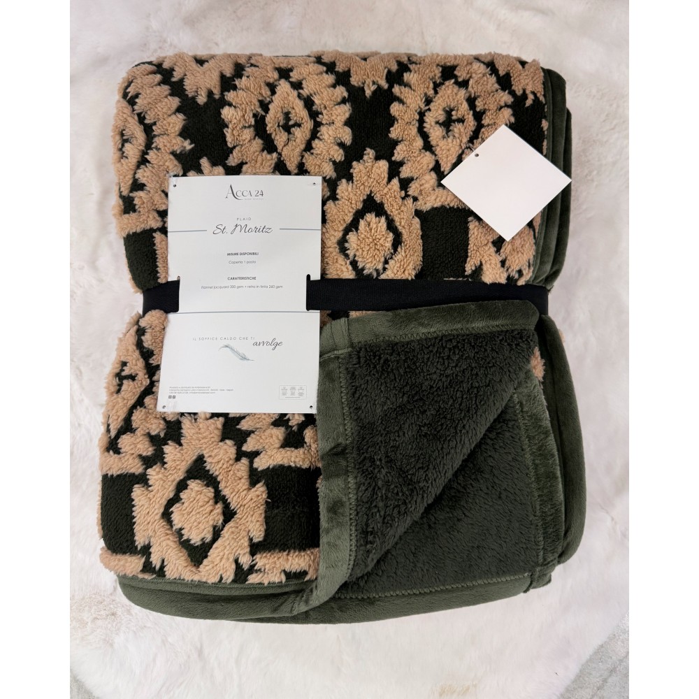 Elegante Plaid St. Moritz Acca24, in morbido Flannel Jacquard 300gr e retro in tinta. Il bordo è in velluto. Un plaid che non passa inosservato, con un gran carattere, in grado di dare corpo e stile alla tua zona living o alla tua camera da letto.