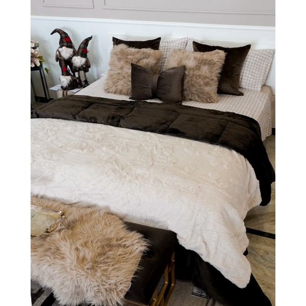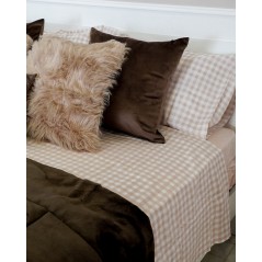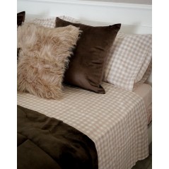 Completo letto a quadri con delicato contrasto beige e bianco. Il lenzuolo di sotto con angoli è un tinta unita con un beige che riprende lo stesso colore di federe e lenzuolo piano. la federa è a sacchetto.