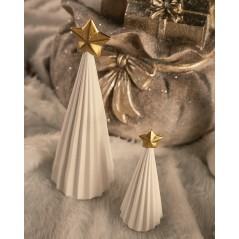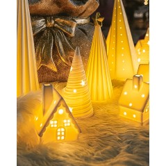 Alberello in porcellana con luce led, con puntale stella dorata, l'alberello ha delle scanalature verticali. Funziona con un tastino On/Off. Disponibile in 3 misure.