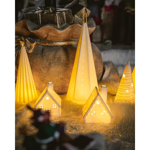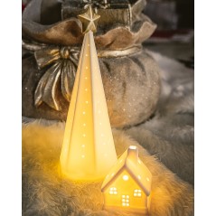 Alberello in porcellana con luce led, con puntale stella dorata, l'alberello ha delle scanalature verticali larghe e dei forellini dai quali viene fuori la luce. Funziona con un tastino On/Off. Disponibile in unica misura.