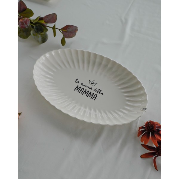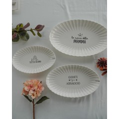 Piatto vassoio ovale in ceramica, disponibile in 3 dimensioni, ognuno caratterizzato da una frase fresca, moderna e divertente. Belli da avere per stupire gli occhi e altrettanto belli come idea regalo.