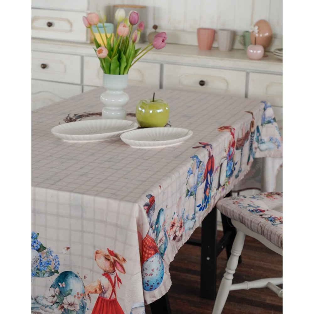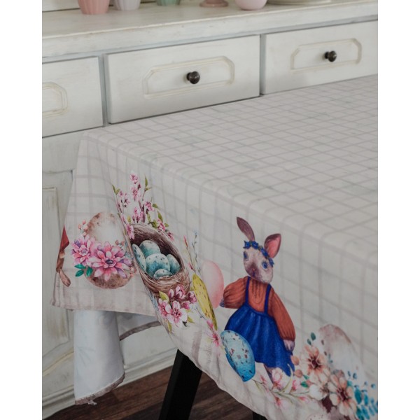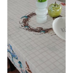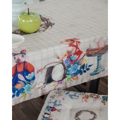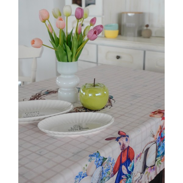 Tovaglia in tessuto a tema pasquale. La tovaglia è caratterizzata da 3 fantasie: butterfly, su cui troviamo delle farfalle, rabbit, su cui troviamo principalmente dei conigli e Country che ha come caratteristica principale un quadrettato. Sono tovaglie con stampa digitale disegno piazzato, con dei colori e dei paesaggi che fanno fare un salto in un mondo di favole e leggerezza. Colori pastello per disegni che sembrano acquerellati direttamente su stoffa.