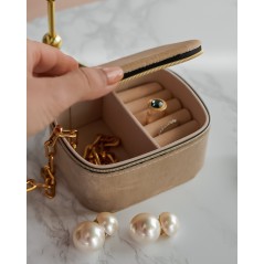 Porta gioielli da viaggio, per chi ama portarsi dietro i suoi gioielli o la sua bigiotteria comodo e pratico, esternamente rivestito in velluto, con zip dorata. Diviso in scomparti.