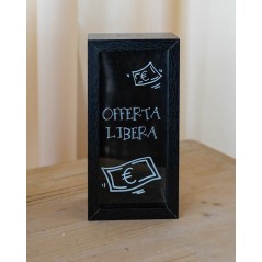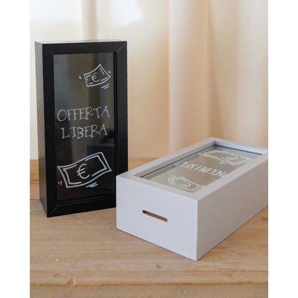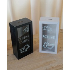 Sempre comodo avere un salvadanaio in casa. Questo è di dimensioni ridotte, molto carino da avere in un angolo della casa, da appendere o da appoggio. Versione Nera con scritta "Offerta libera" o versione con bordo grigio chiaro e scritta su vetro "Piccoli Sfizi".