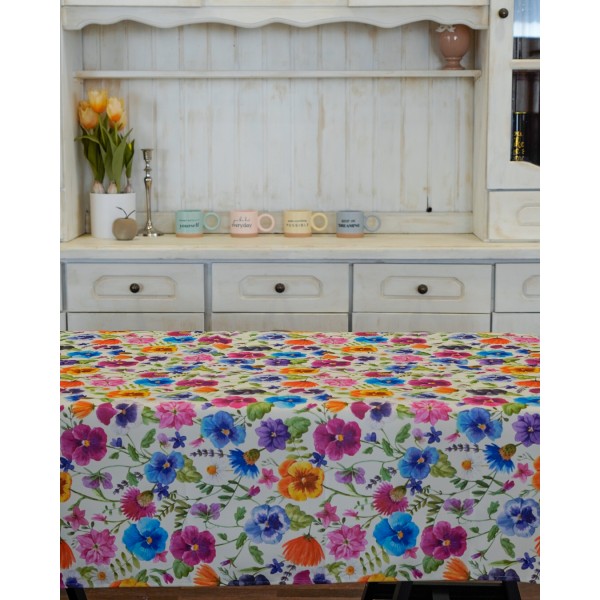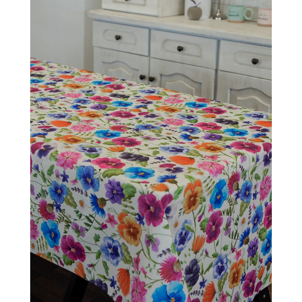 La tovaglia Viola è un'antimacchia in tessuto di Vingi Ricami, realizzata in stampa digitale. Il disegno è caratterizzato da fondo chiaro con brillantini fiori colorati.