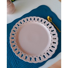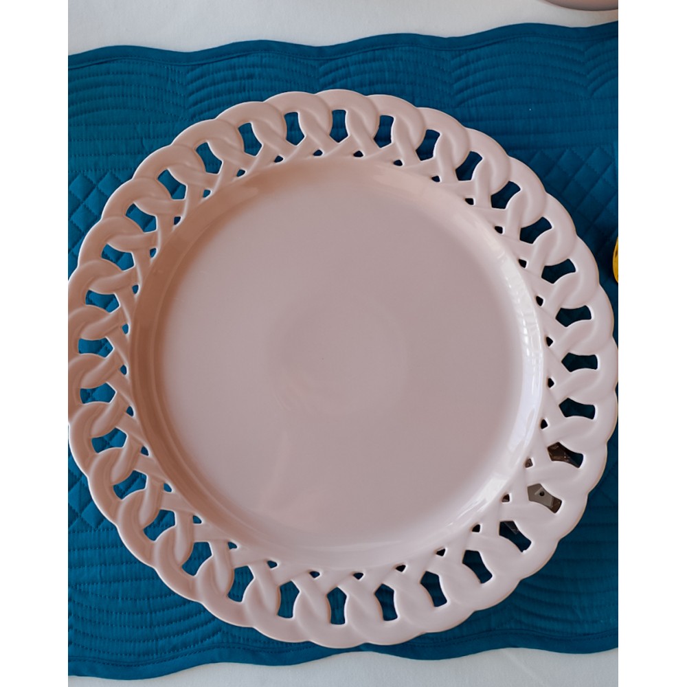 Il piatto da portata è perfetto da usare come vassoio, piatto torta, portabiscotti o anche centrotavola. Tinta unita, lavorato a mano, con bordo traforato.