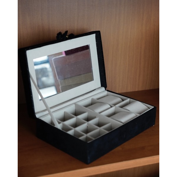 Porta gioielli, per chi ama avere tutto in ordine e a portata di mano.Esternamente rivestito in velluto. Diviso in 4 differenti comparti, utilizzabile sia in verticale impilando gli scomparti, sia in orizzontale se si preferisce avere tutto a vista in un cassetto.