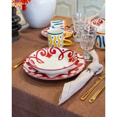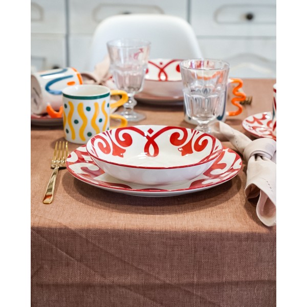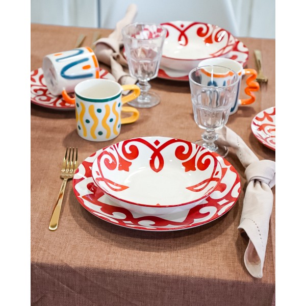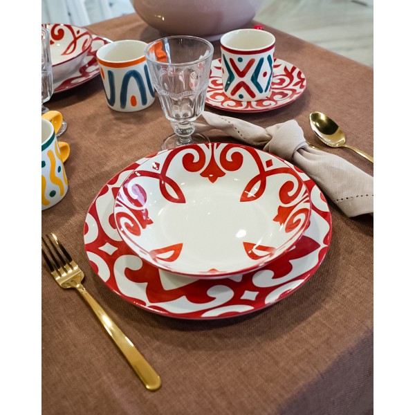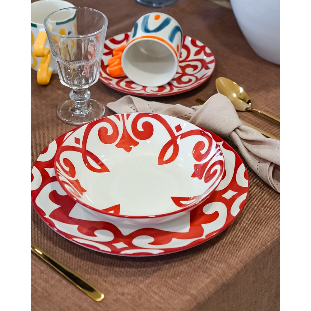Servizio piatti 18 pezzi per 6 persone, bianco e rosso con un motivo geometrico molto particolare. In porcellana