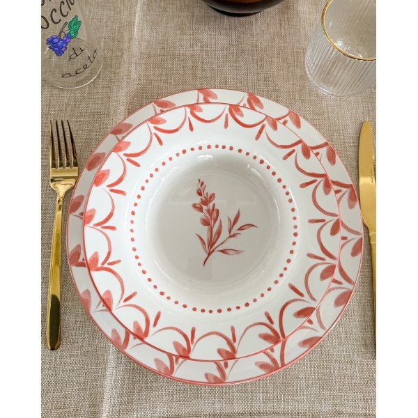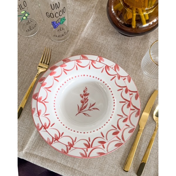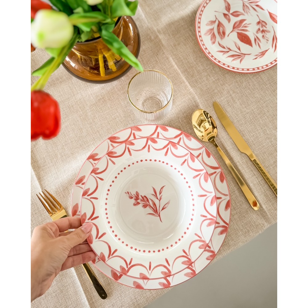 Il servizio di piatti Coral Loira esprime tutta la bellezza e il fascino dello stile cottage, con un tocco raffinato che rende ogni tavola un vero capolavoro di eleganza. Il decoro floreale in una sofisticata tonalità di rosso si ispira alle tradizioni più autentiche, donando un senso di armonia e accoglienza perfetto per qualsiasi occasione. Realizzato in porcellana, è composto da 6 piatti piani da 27 cm, 6 i piatti fondi da 22 cm, 6 i piatti dessert da 19 cm.
