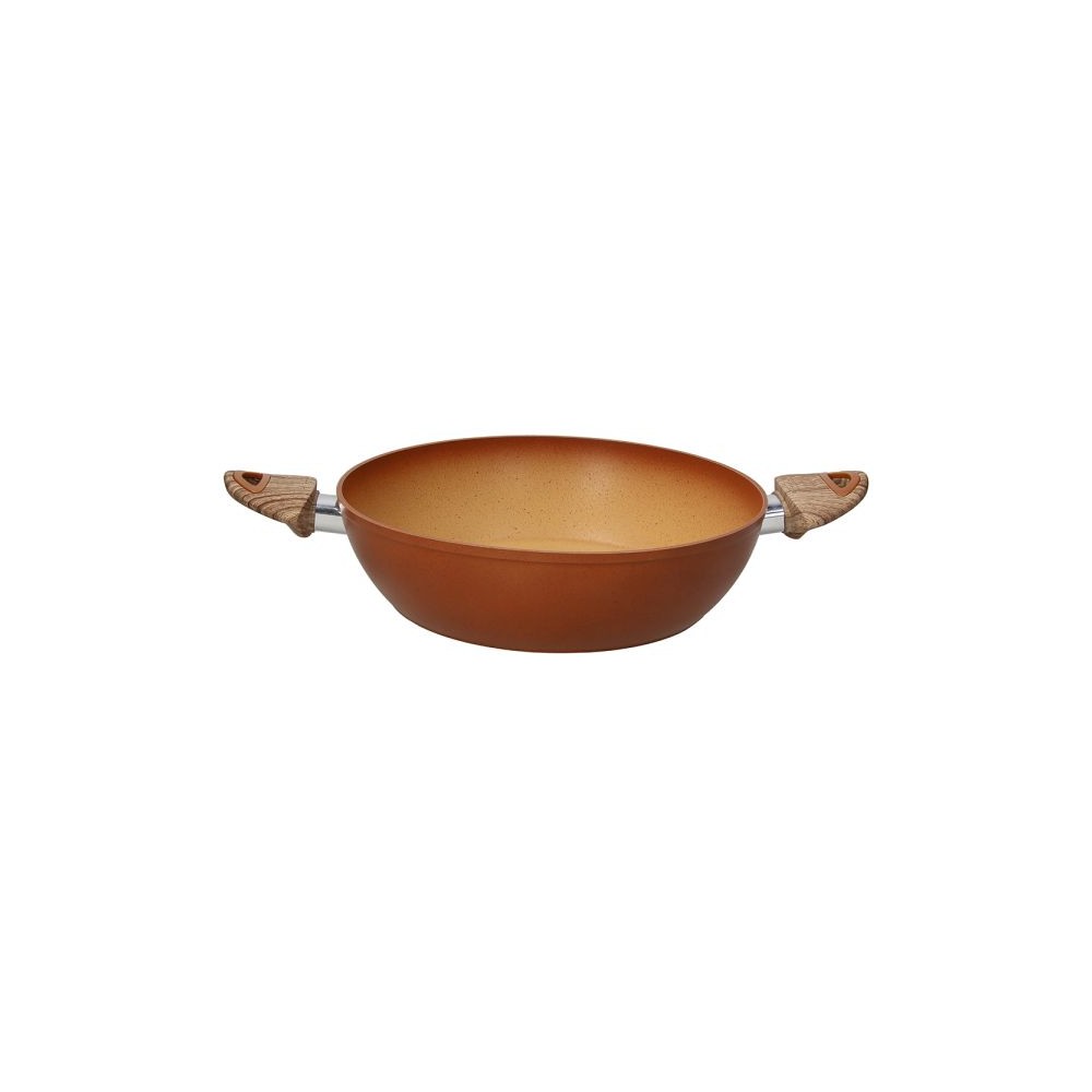 l tegame 24/28 cm Traditional Stone presenta il corpo in alluminio forgiato che consente una distribuzione uniforme del calore ed un fondo ad alto spessore adatto anche all'induzione; il rivestimento esterno è resistente alle alte temperature e il rivestimento interno effetto pietra ruvido è rinforzato a 4 strati per una cucina sana e salutare. I manici sono con finitura soft touch effetto legno ergonomici ed antiscivolo.