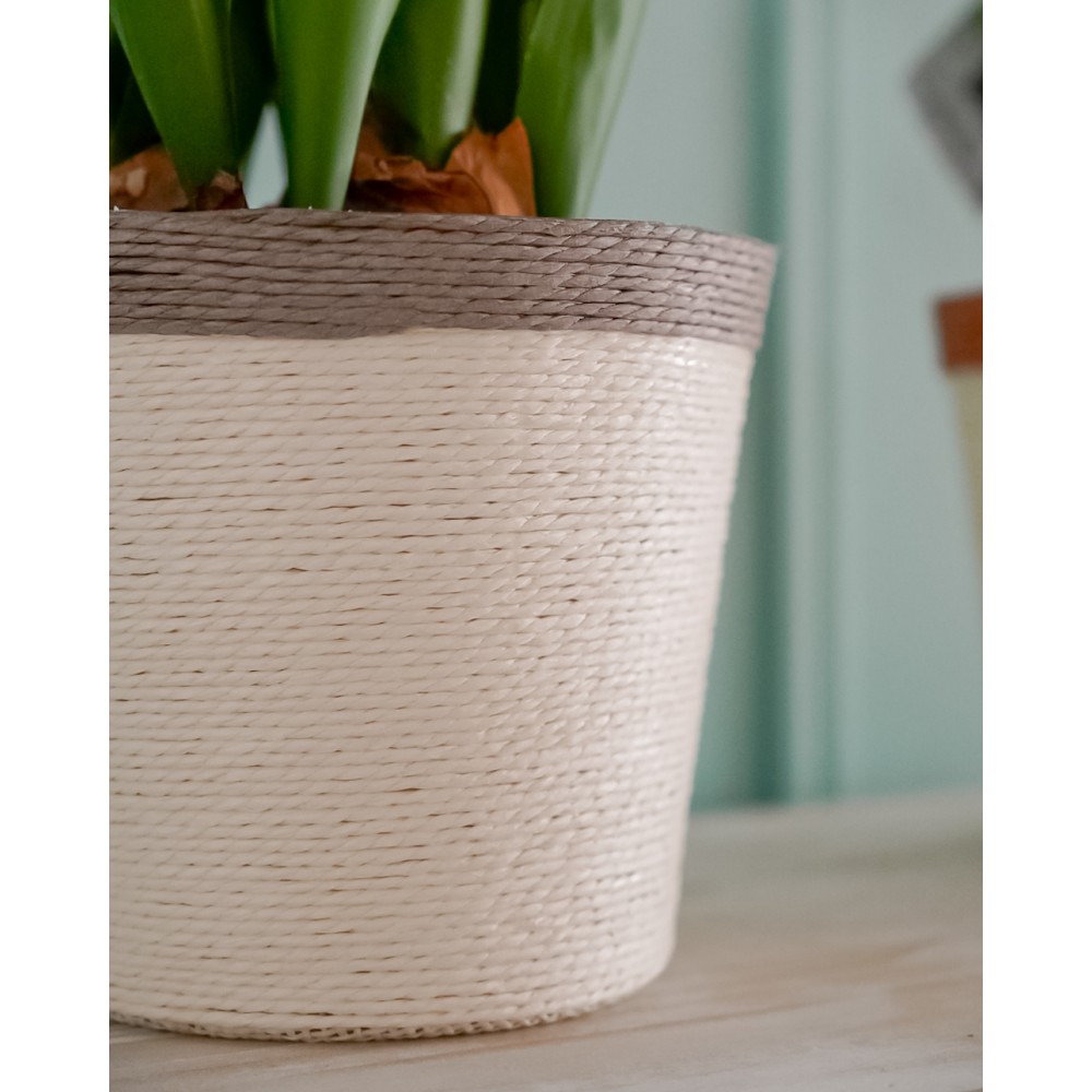 Vaso Fioriera in carta e polipropilene, graziosissima con la parte interna plastificata. Disponibile con bordino di differenti colori.