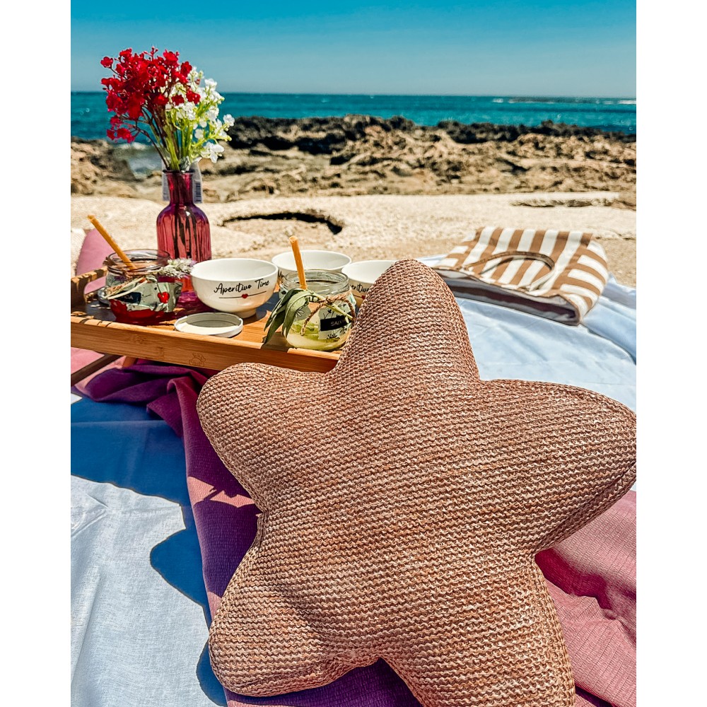 Cuscino arredo 43x43cm, a forma di stella, effetto sacco. Puoi scegliere tre colori: beige, tortora e blu
