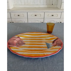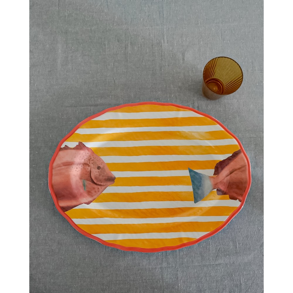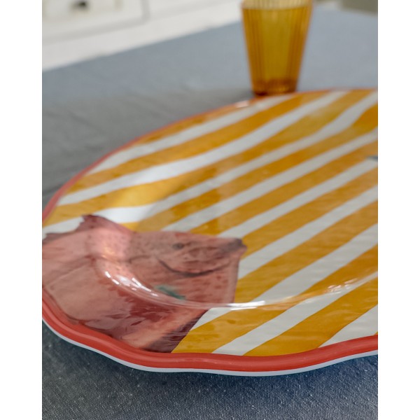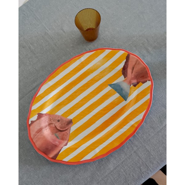 Un connubio di vivacità e praticità, questo piatto ovale da 46 cm si distingue per il dinamico decoro a righe gialle e bianche, valorizzato da un bordo rosso acceso. Il motivo di pesce aggiunge un tocco fresco e giocoso, perfetto per esaltare l’atmosfera estiva. Realizzato in melamina resistente, offre leggerezza, durabilità e facilità d’uso. Ideale per servire con stile, è lavabile in lavastoviglie, garantendo comodità e praticità quotidiana. Non idoneo all’uso nel microonde.