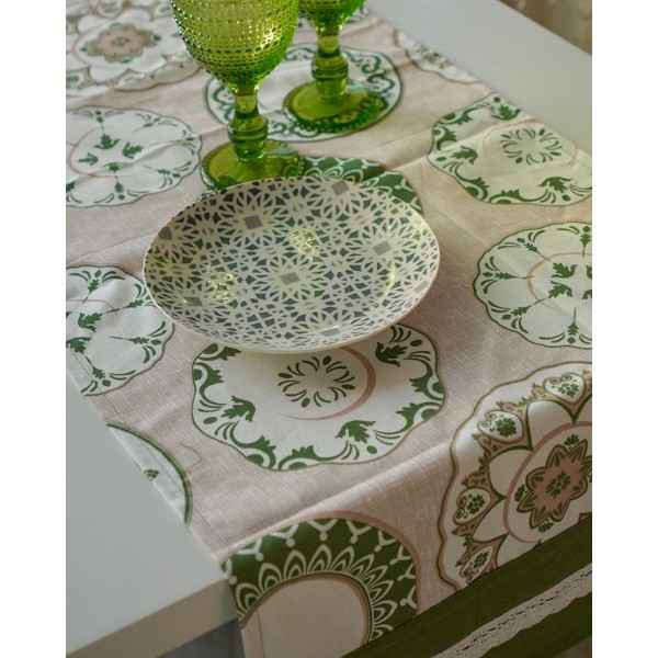 Il runner fa parte della collezione Tolosa, un coordinato da cucina che comprende: Tovaglia per 6 o 12 posti, cuscini coprisedia, runner, centrotavola, cuscini arredo quadrati e rettangolari.