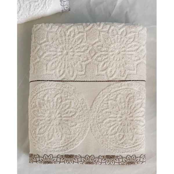 Disponibile in più colori, il telo mare Adel ha un motivo molto delicato nella parte bassa del telo.  Tessuto e peso: cotone 100 - 450gr